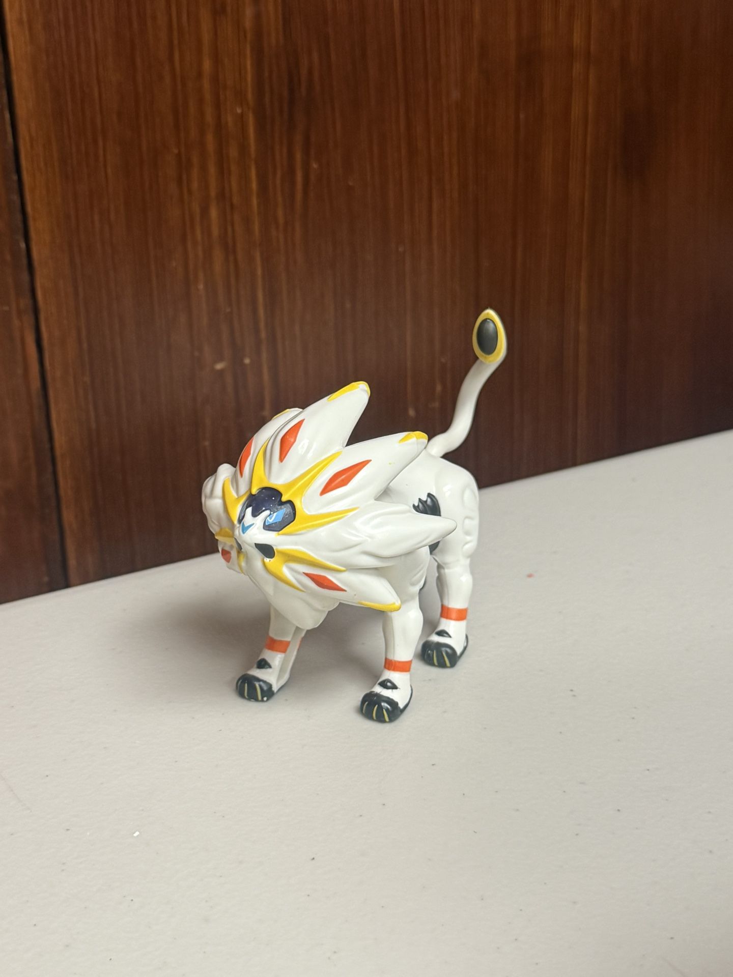Solgaleo Pokémon White and Orange Lion Figurine McDonald's Happy Meal Toy 2017 ‘Measure 5” approximately This model kit allows you to build a figure of Solgaleo, a legendary Psychic/Steel-type Pokemon known as the "beast that devours the sun" The kit features movable parts, such as the neck and mane for roaring poses, and the front legs for threatening poses. Stylish white lion figurine with orange and black accents. Perfect for collectors. Preowned Bundle available for same shipping price