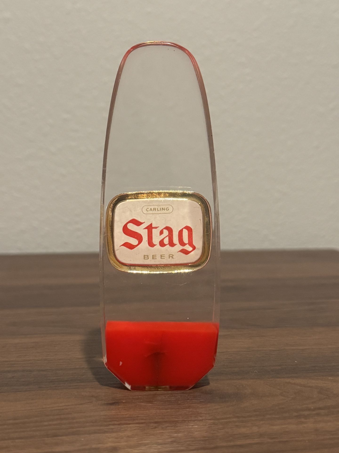 Rare Vintage Carling Stag Beer Tap Handle Mid-Century Lucite. Hard-to-find vintage Carling Stag Beer tap handle. This is the classic "bullet" style made of heavy, clear lucite with a vibrant red base. Features the iconic red Stag logo with "Carling" branding in a gold-bordered inset. A perfect piece of brewing history from the era when Stag was under the Carling Brewery name.