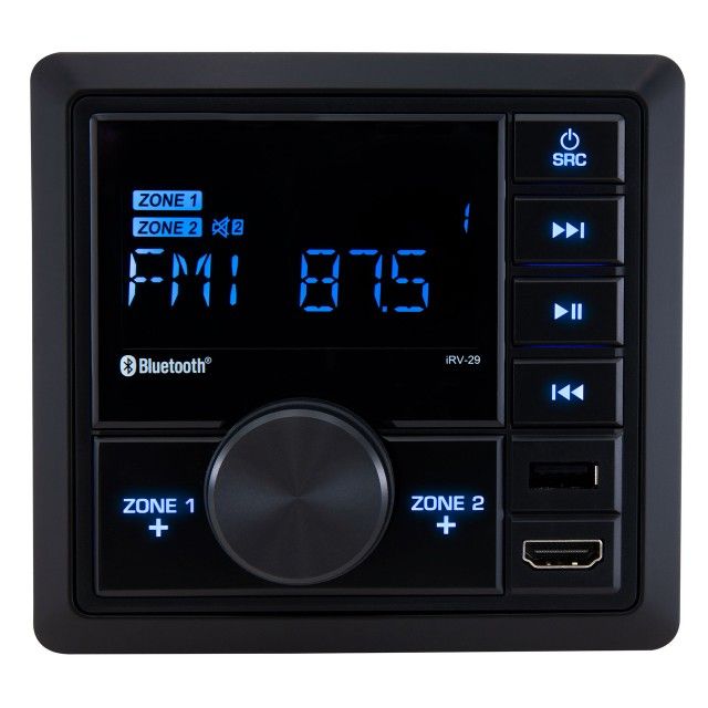 Details: USB RV Media Player Recreational Vehicle Audio Entertainment System Dimensions (overall): 4 7/8"W x 4 5/8"H x 2 3/4"D Dimensions (cutout): 4 1/4"W x 3 7/8"H x 1 7/8"D Remote included Wiring cables included 2 zones LCD Display Clock function Alarm function FM/AM radio operation USB charging port USB operation for MP3/WMA files HDMI High Definition Port Bluetooth capability Using a good quality speaker with 4-8 ohms can result in the best effect for the stereo Technical Data: 12V DC 10 Amp Max 120 Watts