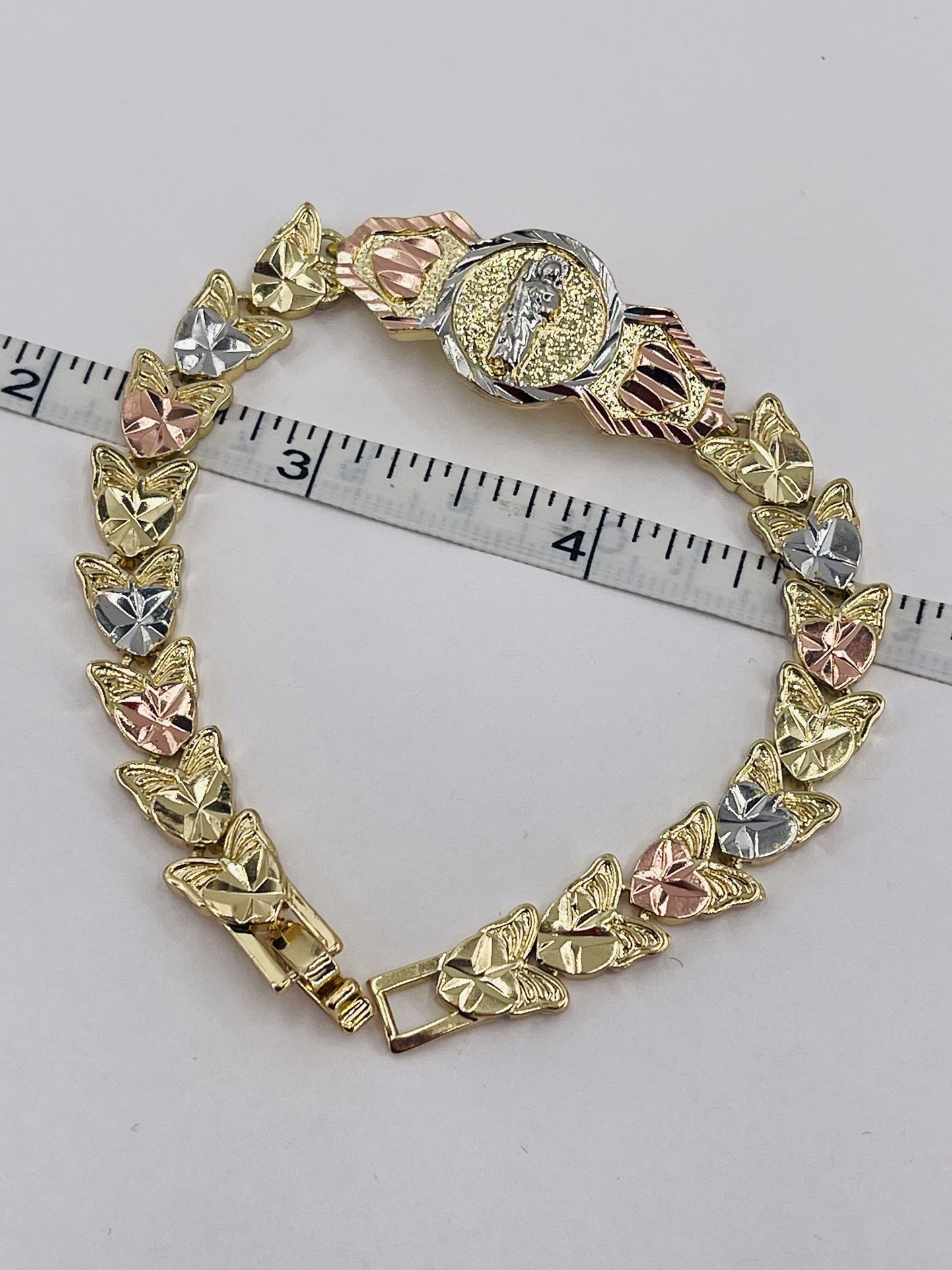 This beautiful bracelet features a gold-plated design with an image of Saint Jude. Perfect for those who want to show their devotion to him, The 14k gold plating gives it a luxurious look, while the intricate design adds a touch of elegance. Whether you're looking for a gift for a loved one or just want to treat yourself, Esta hermosa pulsera presenta un diseño bañado en oro con una imagen de San Judas. Perfecto para aquellos que quieran mostrarle su devoción, El baño de oro de 14k le da una apariencia lujosa, mientras que el diseño intrincado agrega un toque de elegancia. Ya sea que esté buscando un regalo para un ser querido o simplemente quiera darse un capricho,