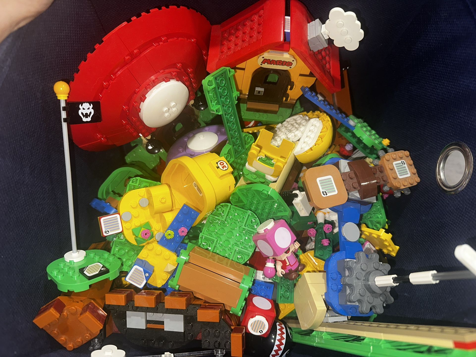 Multiple Super MARIO Lego sets. Mini figurines included (not battery operated characters) Thrown together! Many Toad houses and some others. Can put together with the Mario Lego app or build free style. Some minor pieces may be missing if building with the app. Nothing broken! Too many pieces to take separate pictures.