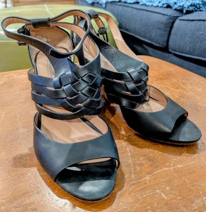 Gorgeous woven black leather wedge heels Only worn a couple times, great condition Scuffed bottom of shoe, minor imperfections on wedge part Women's size 7
