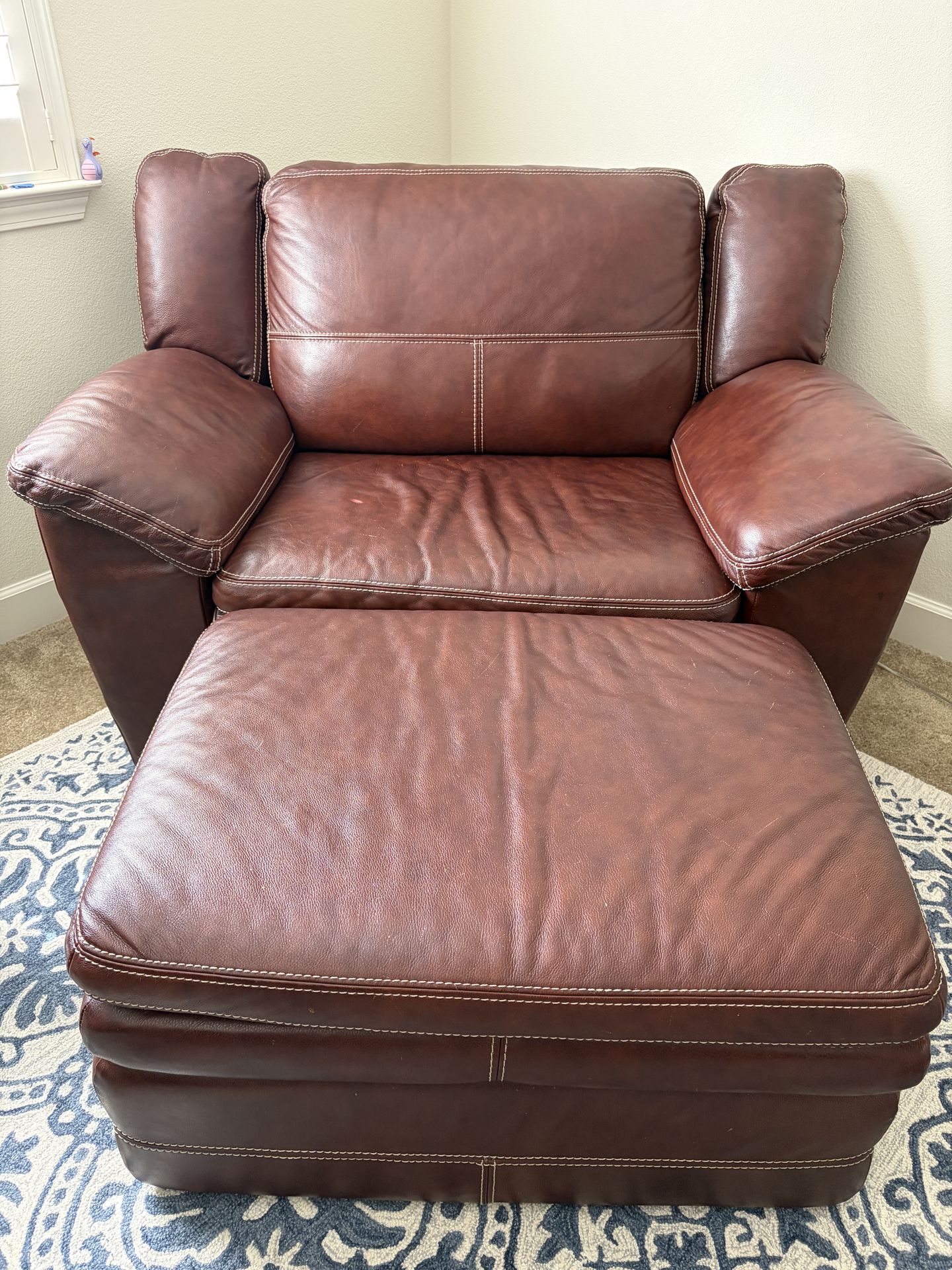 Oversized Leather Armchair with Matching Ottoman Rich brown leather with visible stitching and that perfect soft, broken‑in feel. Both pieces are in great condition—no rips, no sagging, just a comfy, stylish set ready for its next home. Great for living rooms, offices, or a cozy reading spot. Smoke‑free home. Pickup in San Ramon. Ottoman 3’ wide, 19 1/2” tall Chair Floor to seat 19 1/2” tall Floor Base - 4’ wide Seat - 29 1/2” wide Back - 37” tall