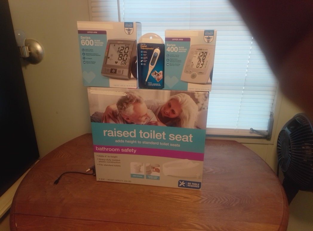 Toilet seat never used. BP monitors both work as they should. Thermometer never opened.
