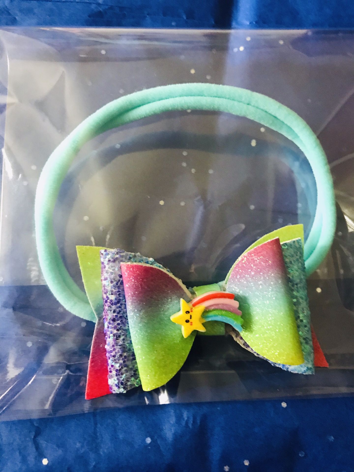 Faux leather and glitter fabric bow with stretchy cotton head bands. Your special little person won’t even know they are wearing it super comfortable. $4.00 each