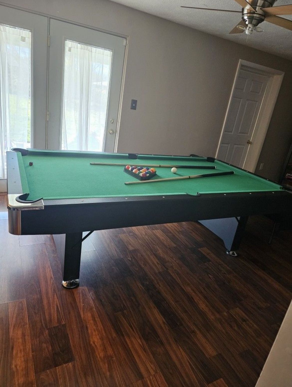 8' pool table Has cosmetic damages but doesn’t affect the game. Folding feet Comes with: * 2 cue sticks * balls * chalk * ping pong balls * ping pong paddles * ping pong net NO PING PONG TABLE TOP Wayfair IQOWEL