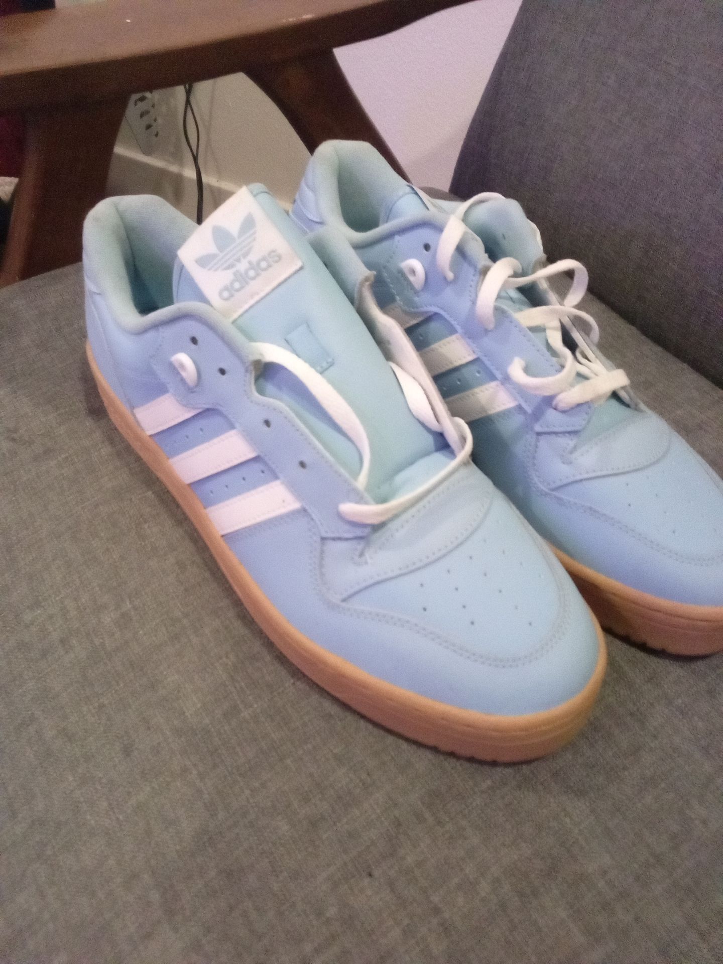 Here's a size 13 Adidas Revelry one Carolina blue w gum sole bottoms . NEVER WORN. tried on . Are in immaculate condition.. sat in a box for months due to injury .. shoot me a deal ?