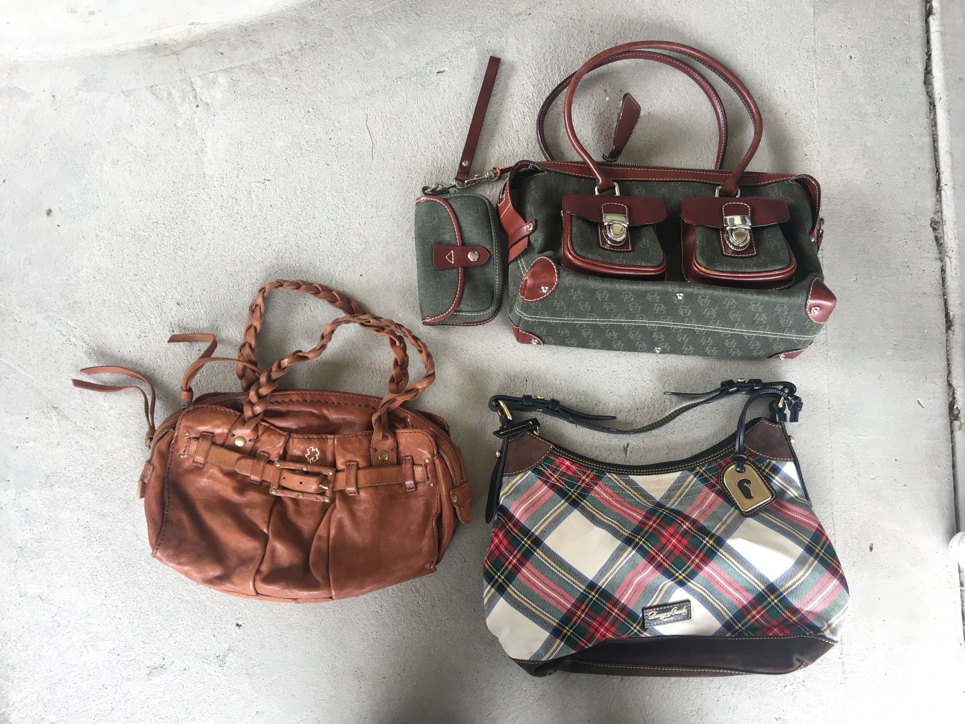 2 Dooney & Bourne purses and 1 lucky brand purse. Brown lucky brand purse - $20 (used) Green/brown Dooney & Bourne purse - $40 (new) Plaid Dooney & Bourne purse - $40 (new)