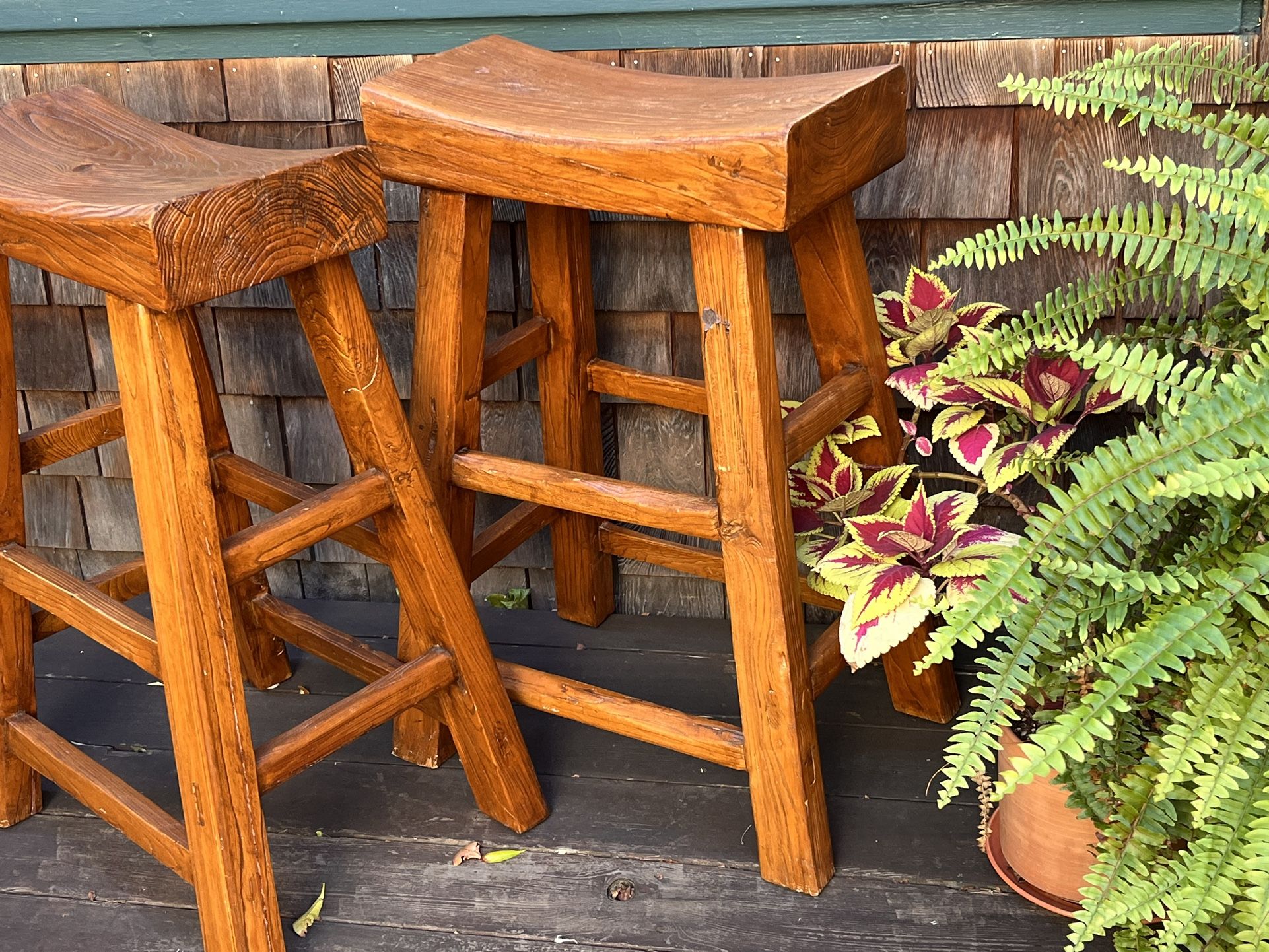 Authentic Chinese wooden stools. Very Sturdy, excellent condition, possibly Elm wood. Outdoor shot is a more true color (depends on the lighting). 30-inches high to top of seat. Dark reddish brown. Set of two. $45 each, pair $80. Cash, please.