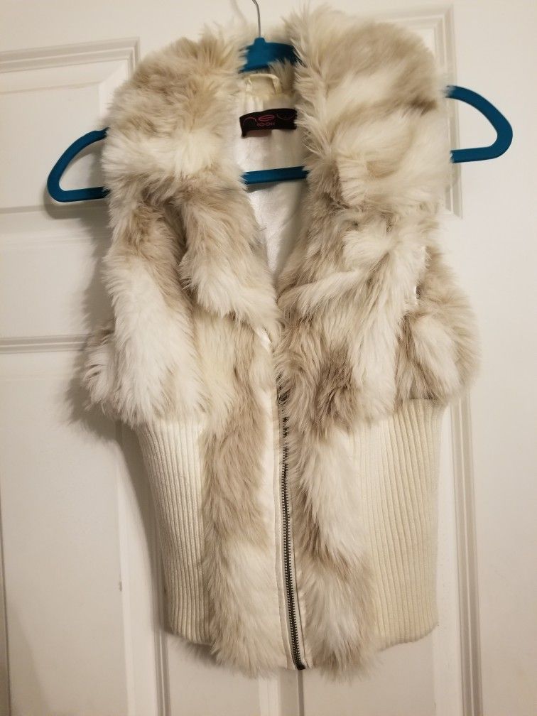 Limited black jacket junior 12, studs on collar, zipper on pockets and sleeves, lined, polyurethane $10 Faux fur cream sweater vest M $10 $10 each