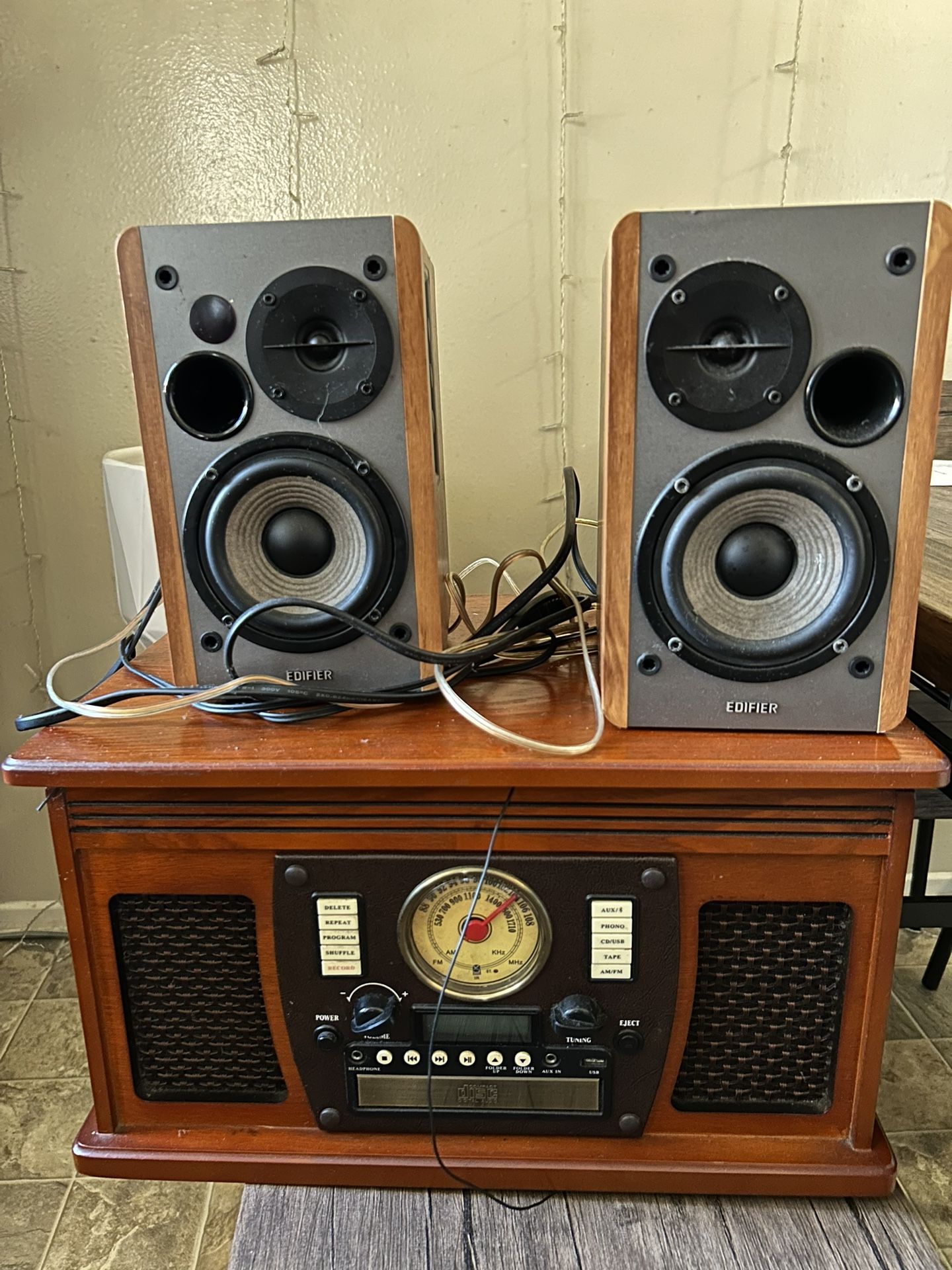 Works and sounds good Bluetooth cd cassete and record player plus am/fm radio. The only problem it has is the volume knob it’s really sensitive and you have to be gentle when turning it.