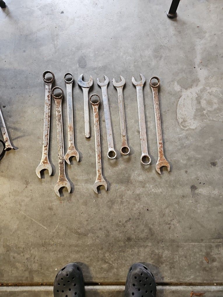 9 large wrenches. 1 -7/16 1=1/2 1-3/8 1-1/8 1-1/4 All used but in good condition 1-5/16
