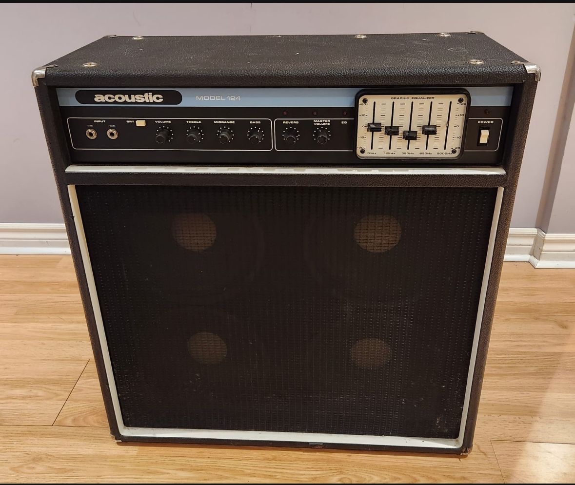 Calling all vintage gear enthusiasts – here's a mid-70s treasure for your consideration. This is an original ACOUSTIC Solid State Amp, model 124 (1974). 100 watts (350 watts) in a 4 x 10 speaker cabinet. Built like a tank in the good ol' USA., this amp has been around the block and back. It's been in studio, on stage and on the road and still can rattle the roof. See photos for details. Read up on this amp online. You'll be surprised how many legends were fans of Acoustic. The good news is the amp is still working and roaring. The bad news is there are a few (fixable) issues. The original foot switch is MIA. There is a plastic head missing from the high EQ slider. And the ground from the 3-prong power cord broke off. Additionally, there are a few cosmetic issues but COME ON, this thing is older than your Dad. In working condition (played today). Loud AF with the EQ, reverb and boost all working properly. If requested I can share a video of the thing in action. Nonetheless, this baby is being sold as-is. You'll want to take her in for a tune-up to make sure everything is okay. They literally don't make them like this anymore, so if old-school sonic power gives you the warm fuzzies, then grab this one