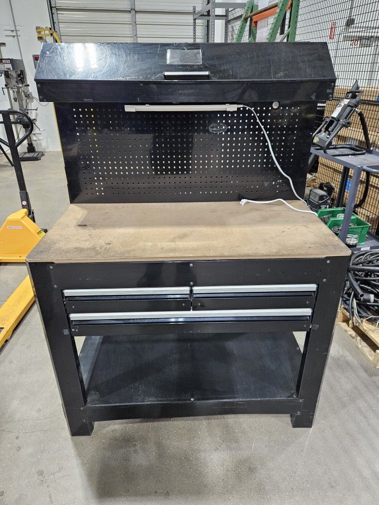 Kobalt 45-in Lx 36.5-in H 3 -Drawers Wood Work Bench Power outlet in the back. 3 drawers plus the storage on top. Light works but a little dim