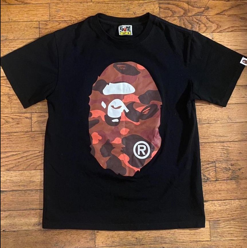 Selling my BAPE tee with the red ape logo on the front and back. Super clean look — fits like a small to medium, not baggy at all. It’s really comfortable and the material feels great. Honestly, I don’t even want to sell it, but I need to make ends meet right now. It’s a dope shirt and I definitely recommend it. Hit me up if you’re interested.