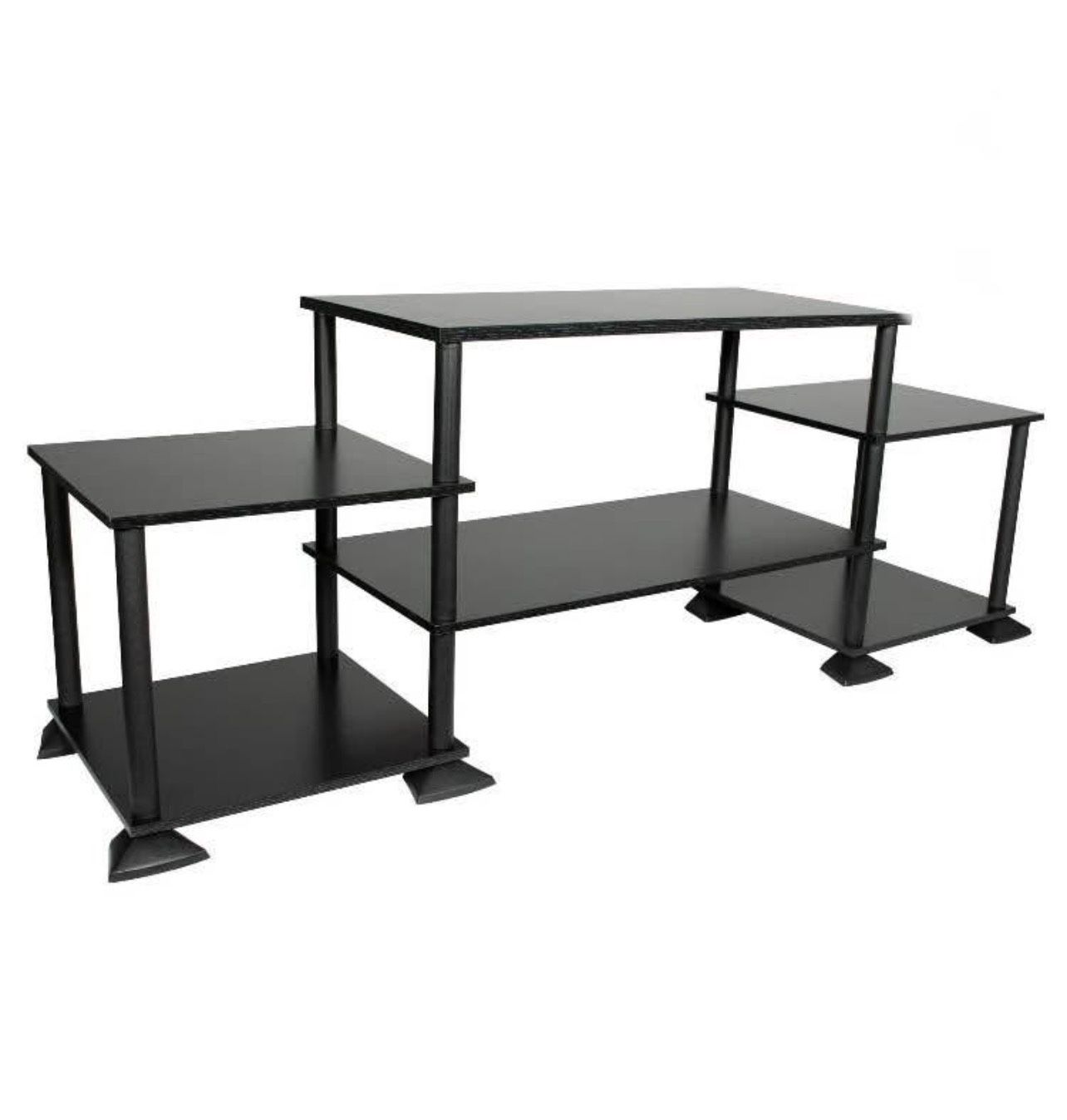 No Tools TV Stand for TVs up to 40", True Black Oak Finish , New Display Capacity: Accommodates flat screen TVs up to 40 inches and a maximum weight of 80 lbs on the top surface. • Stylish Design: Features True Black Oak shelves with a black frame, offering a sleek and modern aesthetic. • Effortless Assembly: Designed for quick, tool-free assembly by one person, making setup simple and fast. • Ample Storage: Includes two side cube compartments (13" W x 13" H) compatible with Mainstays fabric storage bins, and five additional shelves each supporting up to 22 lbs. • Versatile Functionality: Can be utilized as a TV stand, bookshelf, plant stand, entertainment console, or accessible storage unit. Durable Construction: Crafted from manufactured wood and plastic, with overall dimensions of 63.78" W x 17.52" D x 22.83" H.