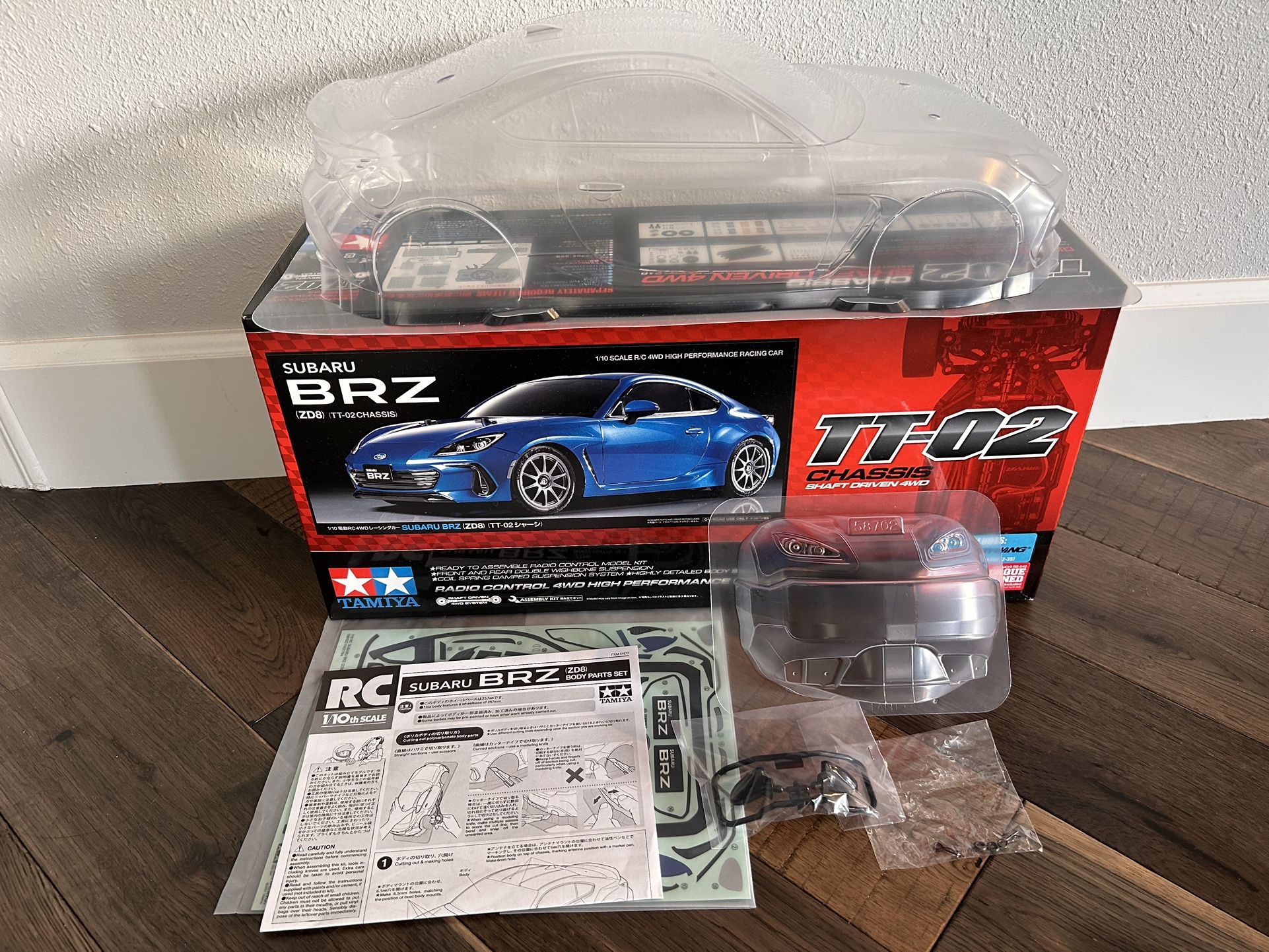 Brand new Tamiya 1/10 RC car Subaru BRZ ZD8 clear Body / shell for sell. It has all the original sticker sheet, window masking, mirror, light buckets and instruction. It is 257mm wheel base (TT-02. No chassis, just body!! Pick up in Bellevue 98006 Tag: TT02, TT01, MST, HPI