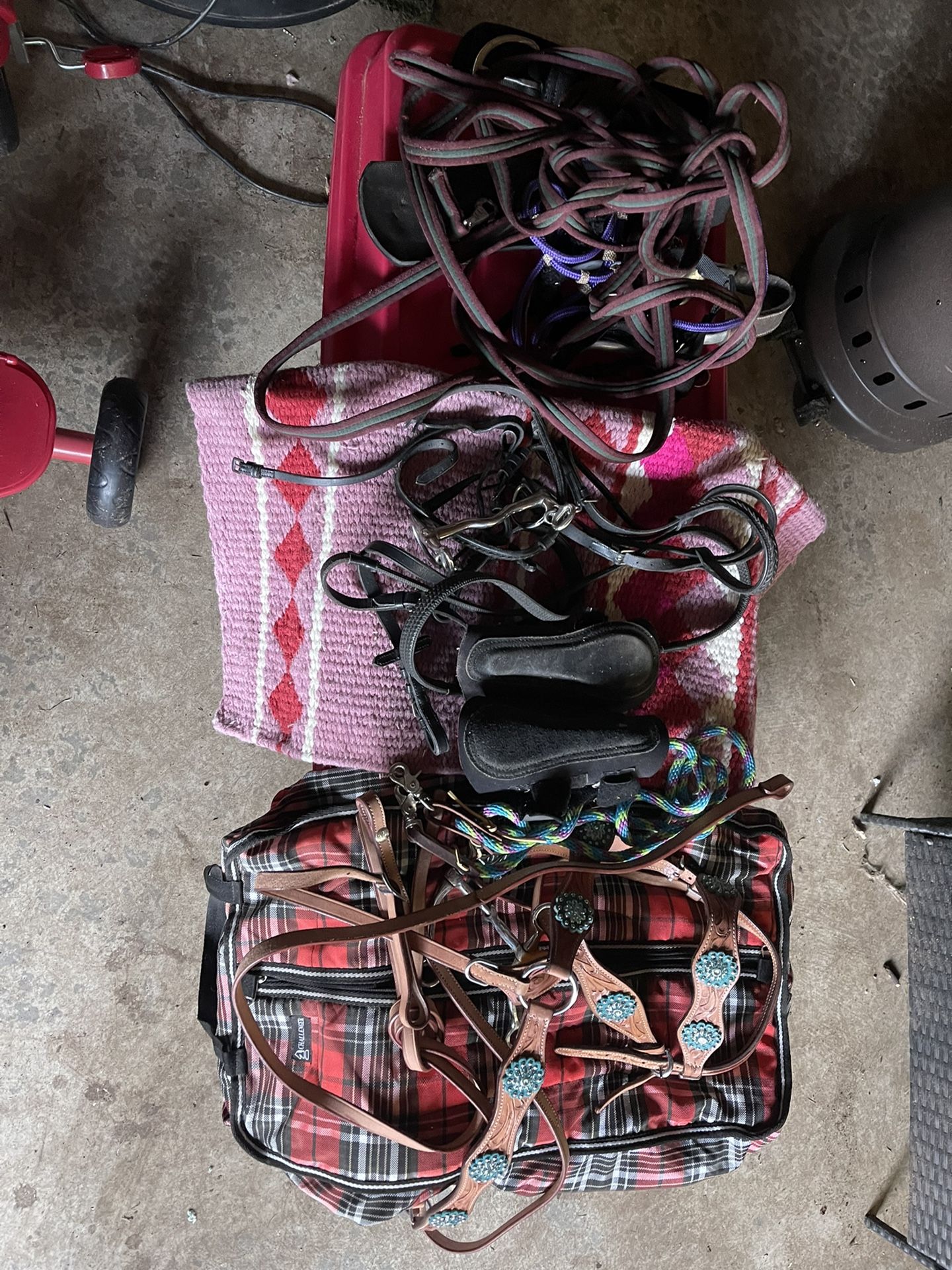 Selling all my horse stuff! 2 Horse blankets, 2 helmets(one new), trailer wrap pads, English cob bridle, western and English bits, 4 sets of reins (3 like new), like new purple western saddle bag, one English girth, 2 western girths, fly mask, hackamore, leg wraps, bridal bag in like new condition, 2 western saddle blankets(one brand new), brand new/never used western pony bridal/breast collar set, 15 English wintec saddle, bareback pad with stirrups, grooming brushes, lunge line, (might have a 15 leather western saddle to, but would have to find it, and like new western saddle carrier bag these two together if found would cost $550 by themselves) Can sell stuff separately! Message for prices! Serious inquiries only! Must be able to pick up in Bonney Lake!