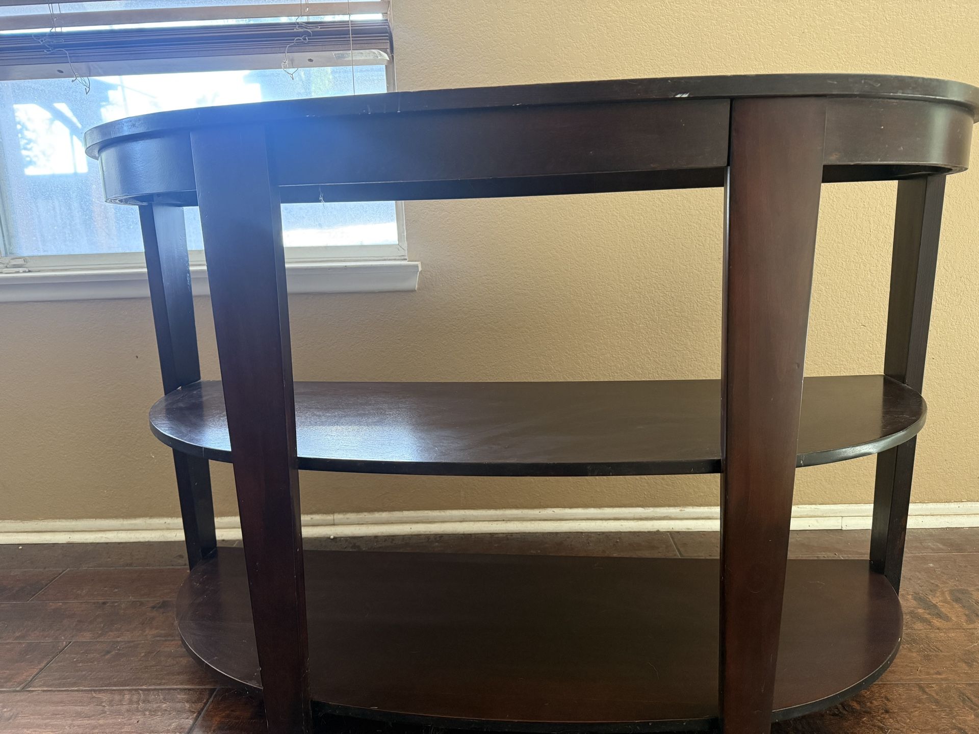 3 level mahogany wood colored coffee/end table, half moon shaped. Slight imperfection on top layer of wood (see photos). I’m sure that could be easily repaired with wood stain. 30” H x 48” W. For pickup only.