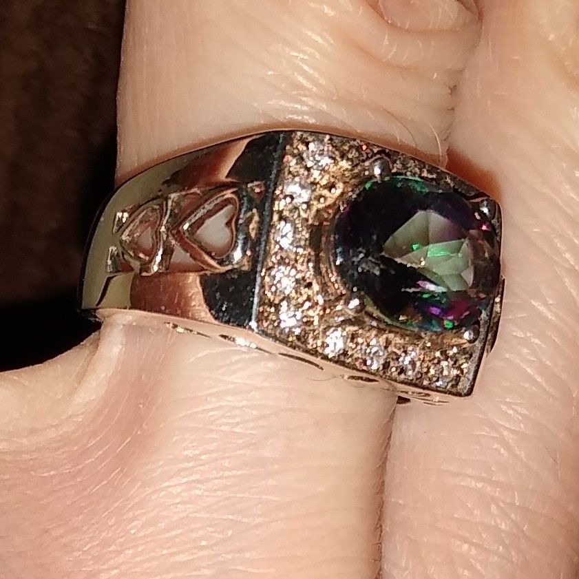 Up for sale is this stunning new stamped 925 very sturdy solid setting genuine oval mystic Topaz ring SIZE 5.25 that is colored very much like an Alexandrite stone, and has a Halo of sparkly white Sapphires around the band. This ring also has very cool hearts etched up the side of the band which make it perfect for π Valentine's Day!!! From our smoke-free home.