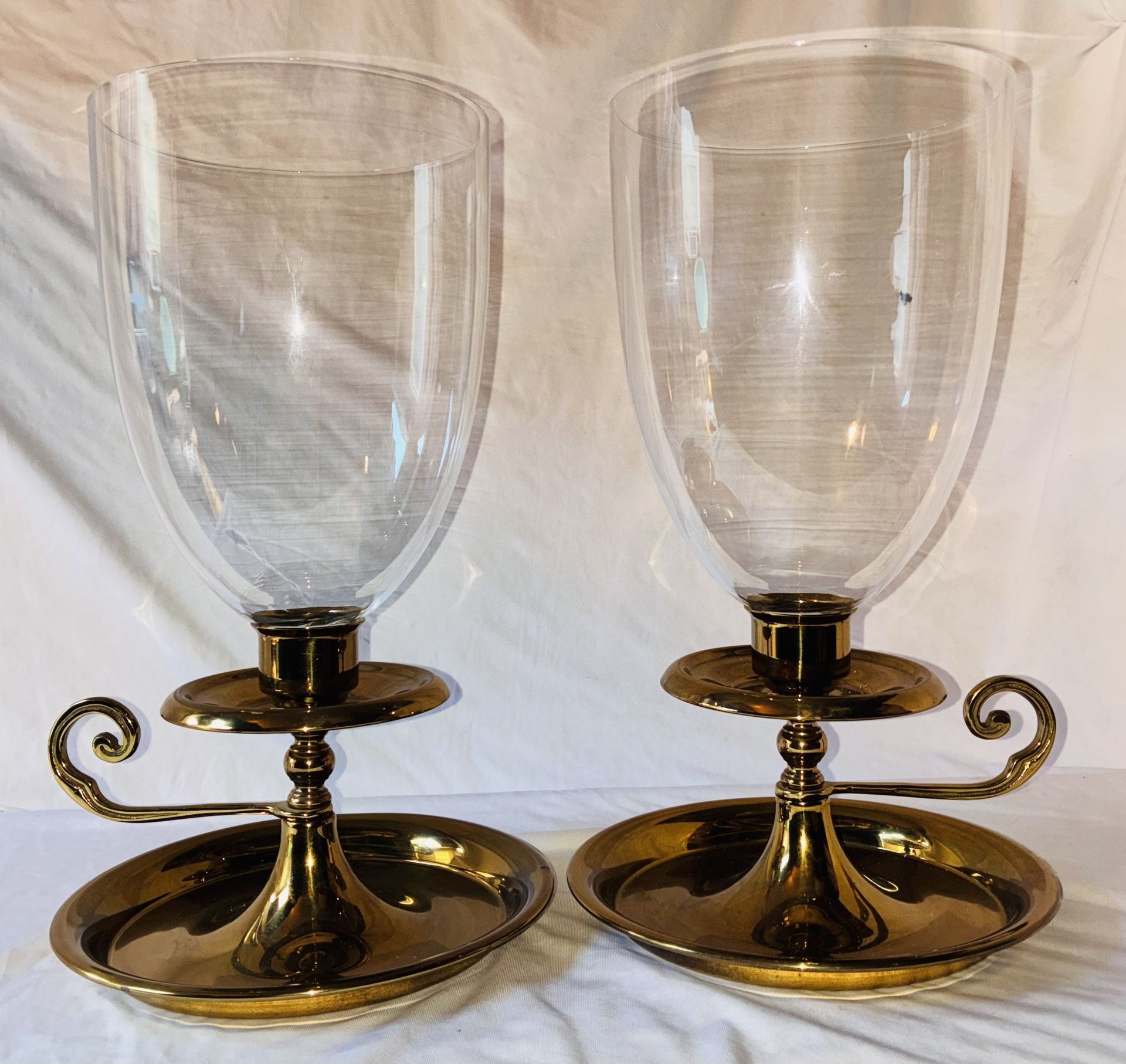 Set of 2 large candle holder. Glass top. Brass gold bottom , with handle. All in great condition, no damages , no cracks , no broken parts. Normal wear to its age and use. This is a used item. (Not by me) It’s been used before. Please look through every picture. And are welcome to come see with no compromise! Price is for both!