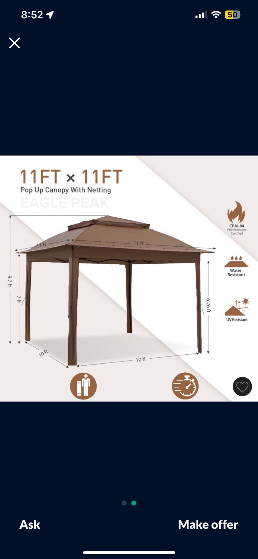 Have a 11x11 canopy gazebo, pop-up tent Used once. When used we only built the tent didn’t use the screen mesh doors Easy to pop up easy to put away Need to free storage so this is taking space For anymore questions please message me thank you