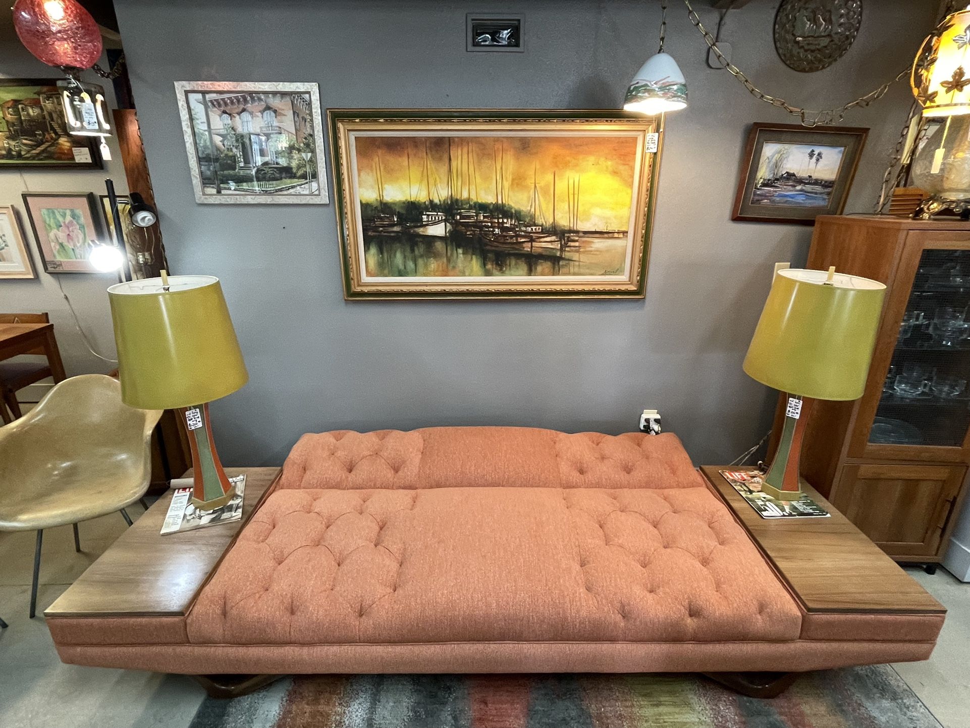 MCM Click Clack Sofa Reclines and fold flat into bed Has built in end tables New Orange upholstery 105 inches long 30 inches tall Can be seen at Mafe’s Mall new address 11560 SE 222nd Dr Damascus, Or. 97089 Delivery is available