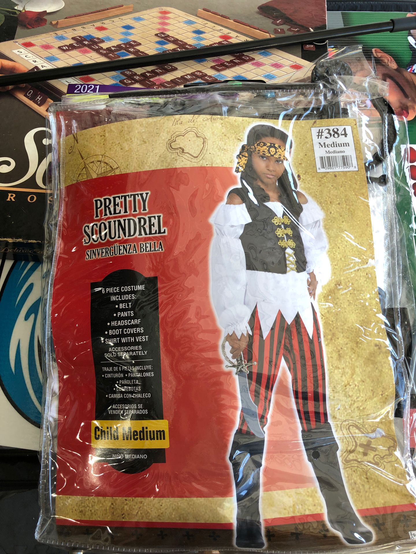 Youth size Medium. She can hit the high seas in this cute pirate costume for girls. The white off-the-shoulder top features a jagged hem and an attached black vest with gold detailing. The red and black striped pants are a pirate outfit classic. Slip on the black boot covers and gold skull-print head scarf to complete this pretty pirate costume. Sword included! Regular price $29.99 and $7.99 for sword