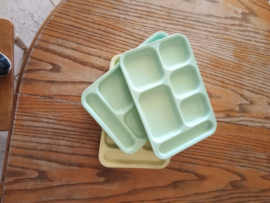 Price is for all three! Dallas Ware Vintage melmac cafeteria or picnic divided trays. Excellent condition on two mint green trays. One chip on back side of yellow tray as shown in picture.