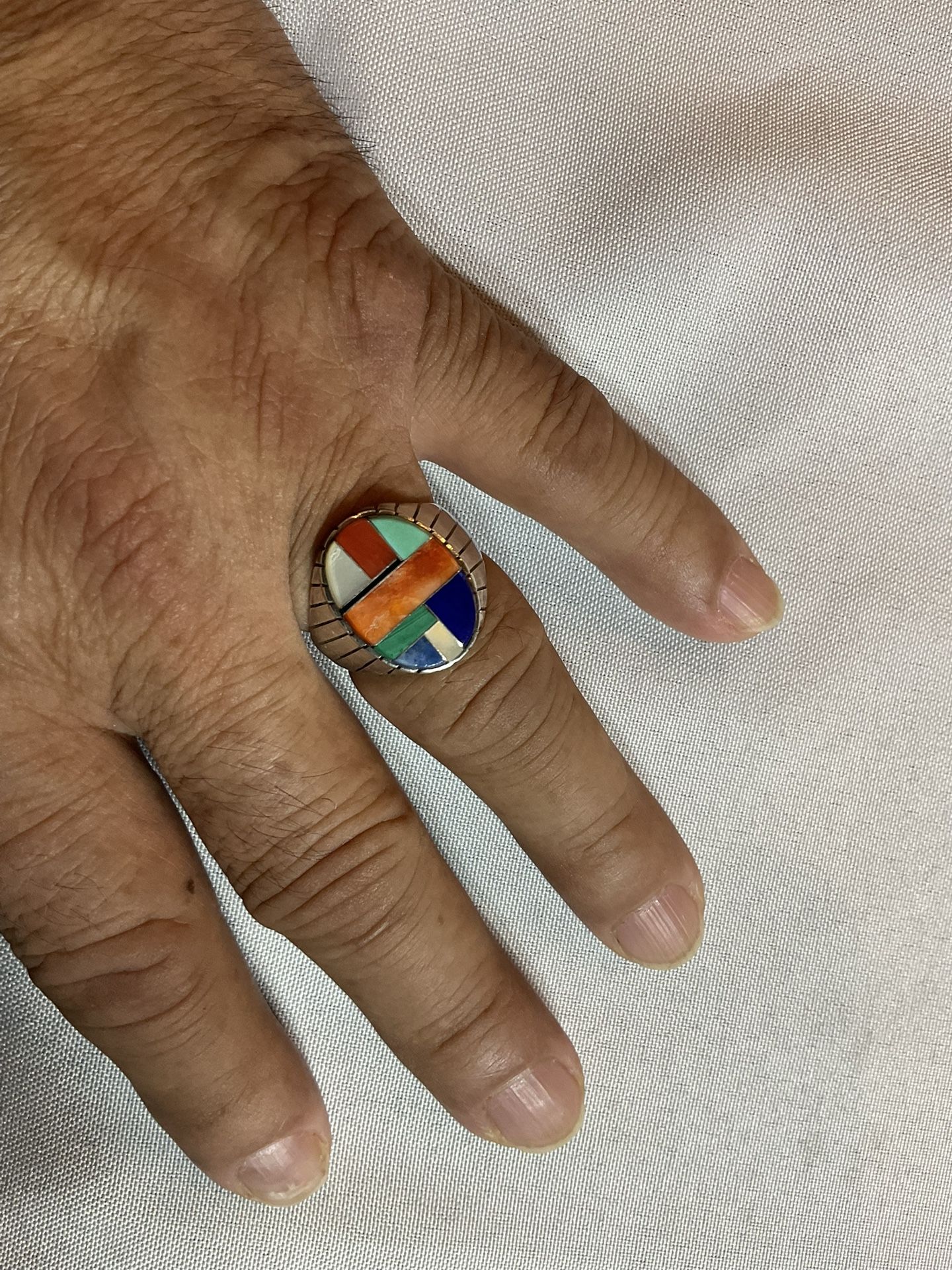 NATIVE AMERICA NAVAJO STERLING SILVER 925 MULTI STONE INLAY MOSAIC OVAL RING MAEN’S 11
