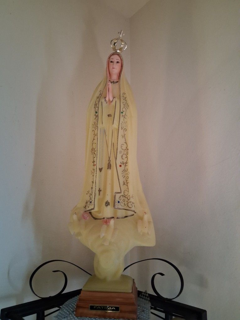 Excellent condition Crafted in Fatima, Portugal, it features jewel-toned accents, gold details. Hand painted glass eyes adorn it's wood composition. Perfect for any sacred space, it inspires devotion and prayer. Best offer!
