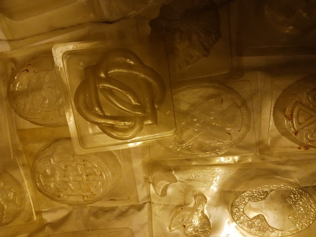 97 soap molds - some with multiple molds in the sheet - celtic, nature, holiday, floral, simple design, sport. Frogs, turtles, shells, sun, moon, leaves, etc. Six large metal candle molds Glycerine soap chips and soap powder Dyes (not sure if they are still good) Wicks Candy thermometer