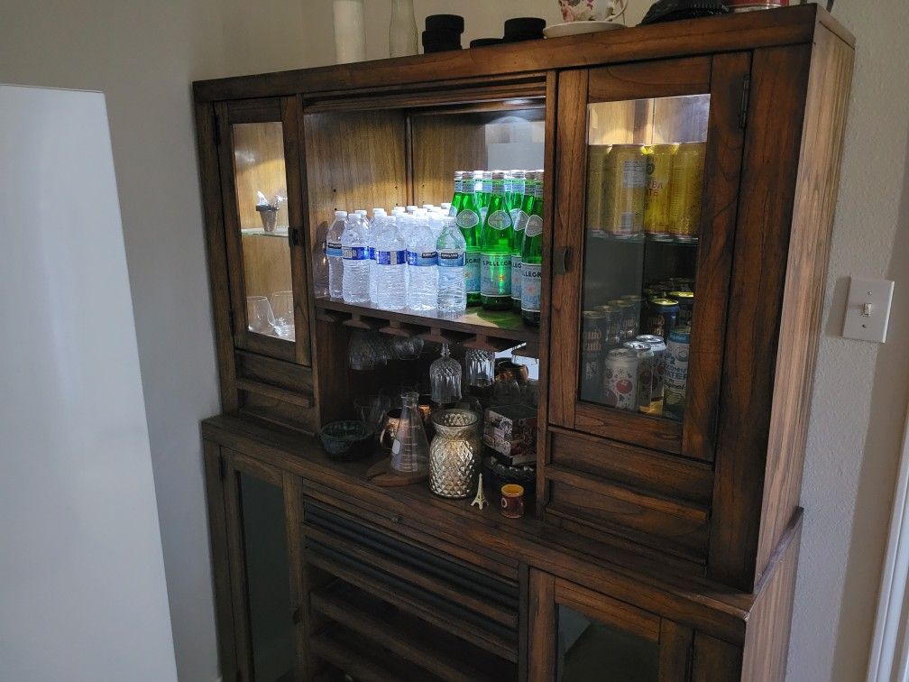 Great wooden bar with lights that are activated by touching hinge, wine glass holders, glass shelves and Wine bottle holding drawers.
