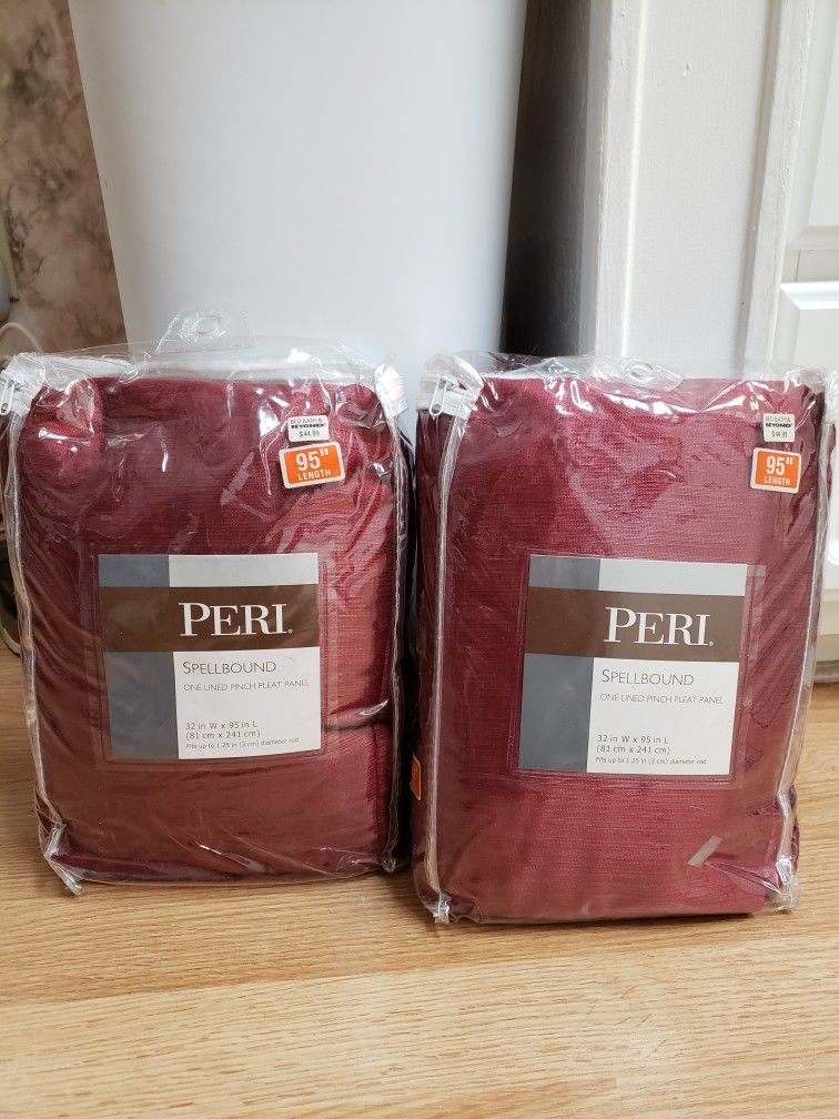 Brand new,full length, 32" W×95"L, lined pinch pleat panel, dark red in color, cost like $50 each at bath& beyond store. I have 2 panels ,I'm asking $50 for both, it's like buy one get one free.