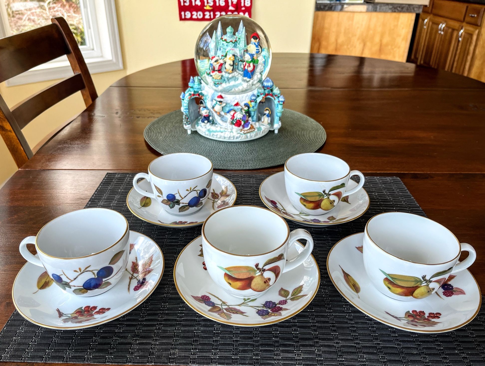 Set of five fine porcelain Evesham Gold cups and saucers. Made in England these vintage porcelain cups and saucers are in excellent, like new condition. Each cup and saucer, trimmed in gold, has a colorful pattern of apples, plums and berries. Just in time for Christmas. Will sell each cup and saucer set individually for $10 each or entire set of five for $45. Please see my other posts and thank you for looking.