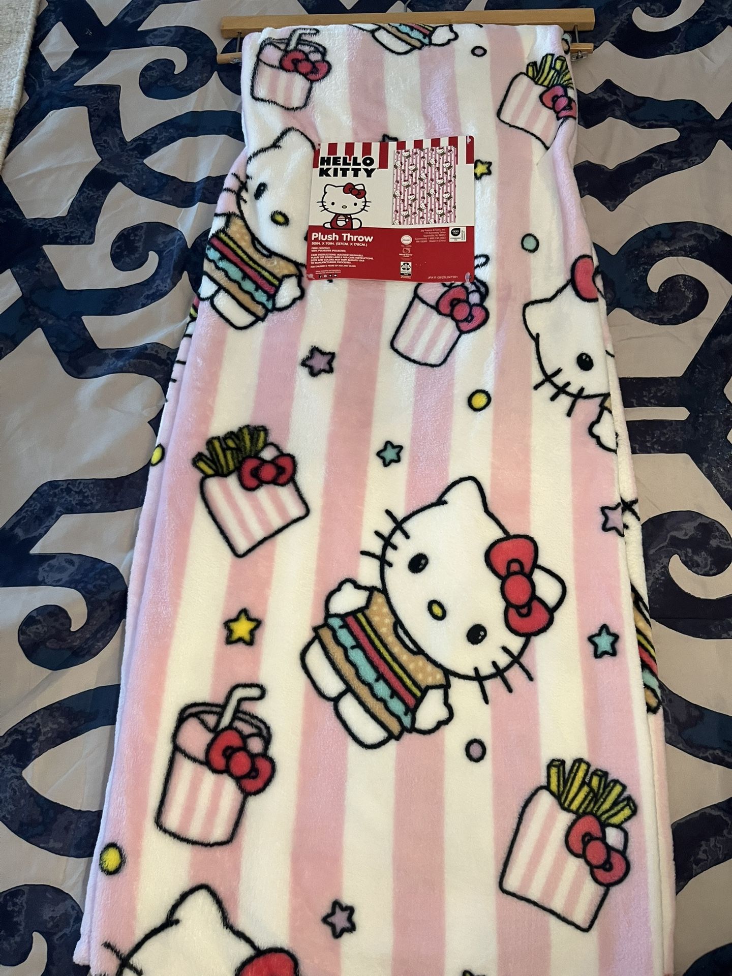 Brand new hello kitty blanket. Open to offers. Hello kitty in a mini hamburger costume with hello kitty cup drinks around blanket.