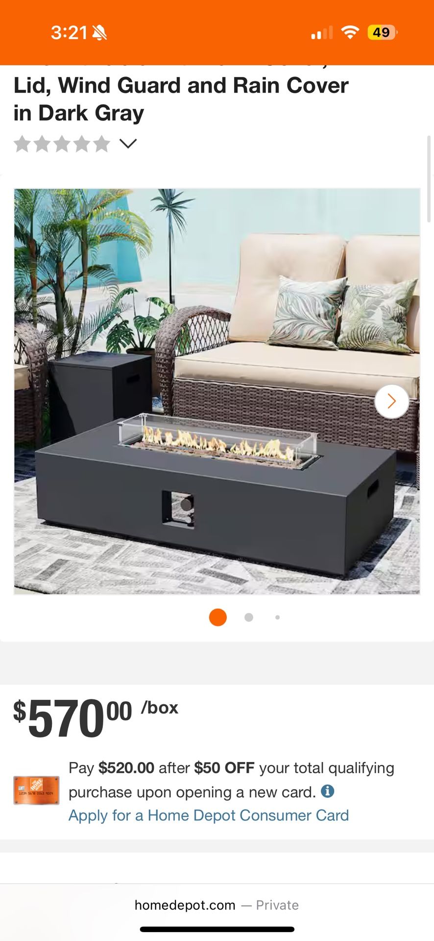 Originally: $570. Never been used. Bought less than a month ago and has been kept under a cover. Comes with a tank cover too. https://offerup.com/redirect/?o=aHR0cHM6Ly93d3cuaG9tZWRlcG90LmNvbS9wL1BBVElPLVdBVENIRVItNTYtaW4tUmVjdGFuZ3VsYXItSXJvbi1PdXRkb29yLUZpcmUtUGl0LVRhYmxlLXdpdGgtVGFuay1Db3Zlci1MaWQtV2luZC1HdWFyZC1hbmQtUmFpbi1Db3Zlci1pbi1EYXJrLUdyYXktUEgtQzU2S0QtV0gtUVQvMzMyNDU5Mzk4