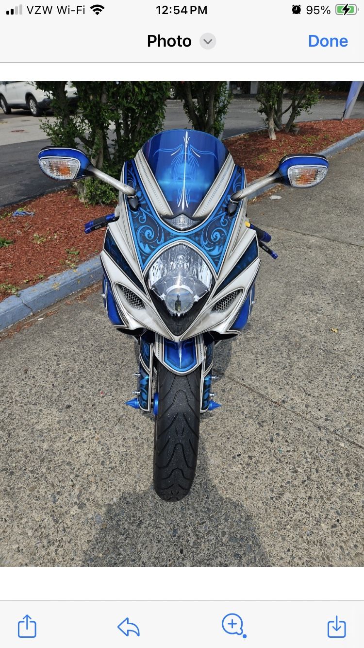 2007 fully custom suzuki gsxr1000 . With 15000 miles .. . It has air suspension . Bluetooth amp with 3 speakers . 360 back tire . Lowered. Stretched ..2 chains. Custom airbrush paint chrome rims. Led glow light kit .. key with remote .. title and registration ..its a 30, 000 dollar bike . Never saw water and rain. ... $15,000 or best offer