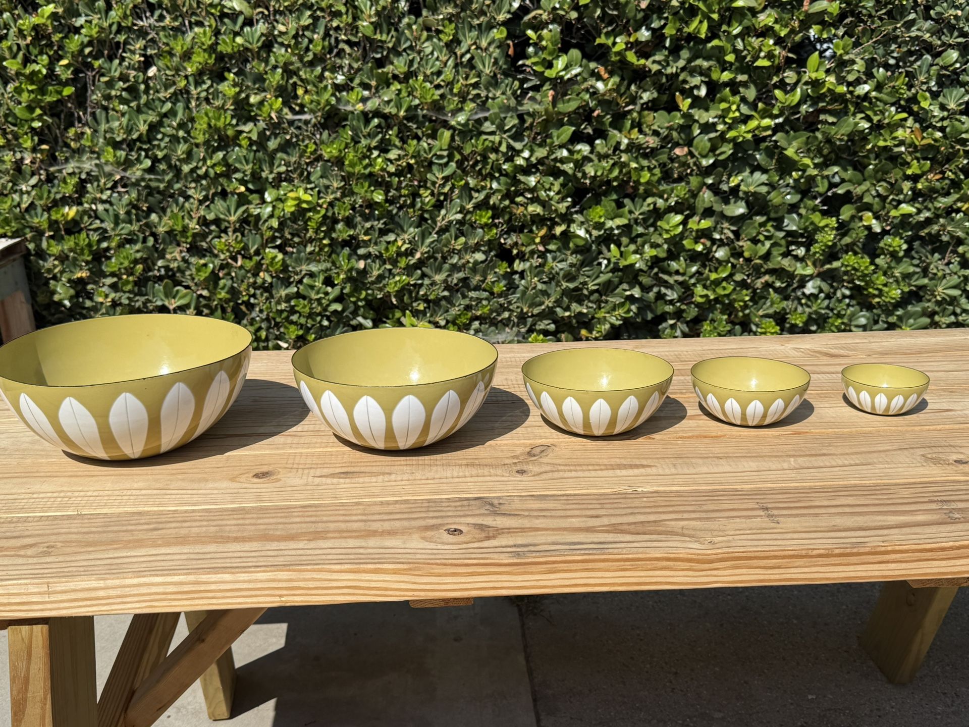 Excellent full set of catherineholm white on olive lotus bowls. (4, 5.5, 7, 9.5 and 11 inch bowls) See pictures but edges are intact and there is very few chips as pictured considering their age. Please reach out with questions or for more pics. I rarely see bowls in this condition, enamel chips easily Buyer pays shipping via PS for best rates. Crossposted, PayPal invoice only.