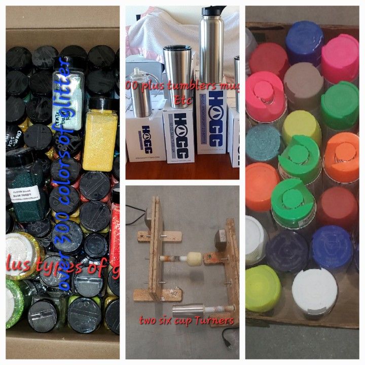 200 plus stainless steel brand new cups. 300 plus types of glitter. Two 6 cup Turners. Dozens of cans of spray paint. And a bunch of assorted craft stuff