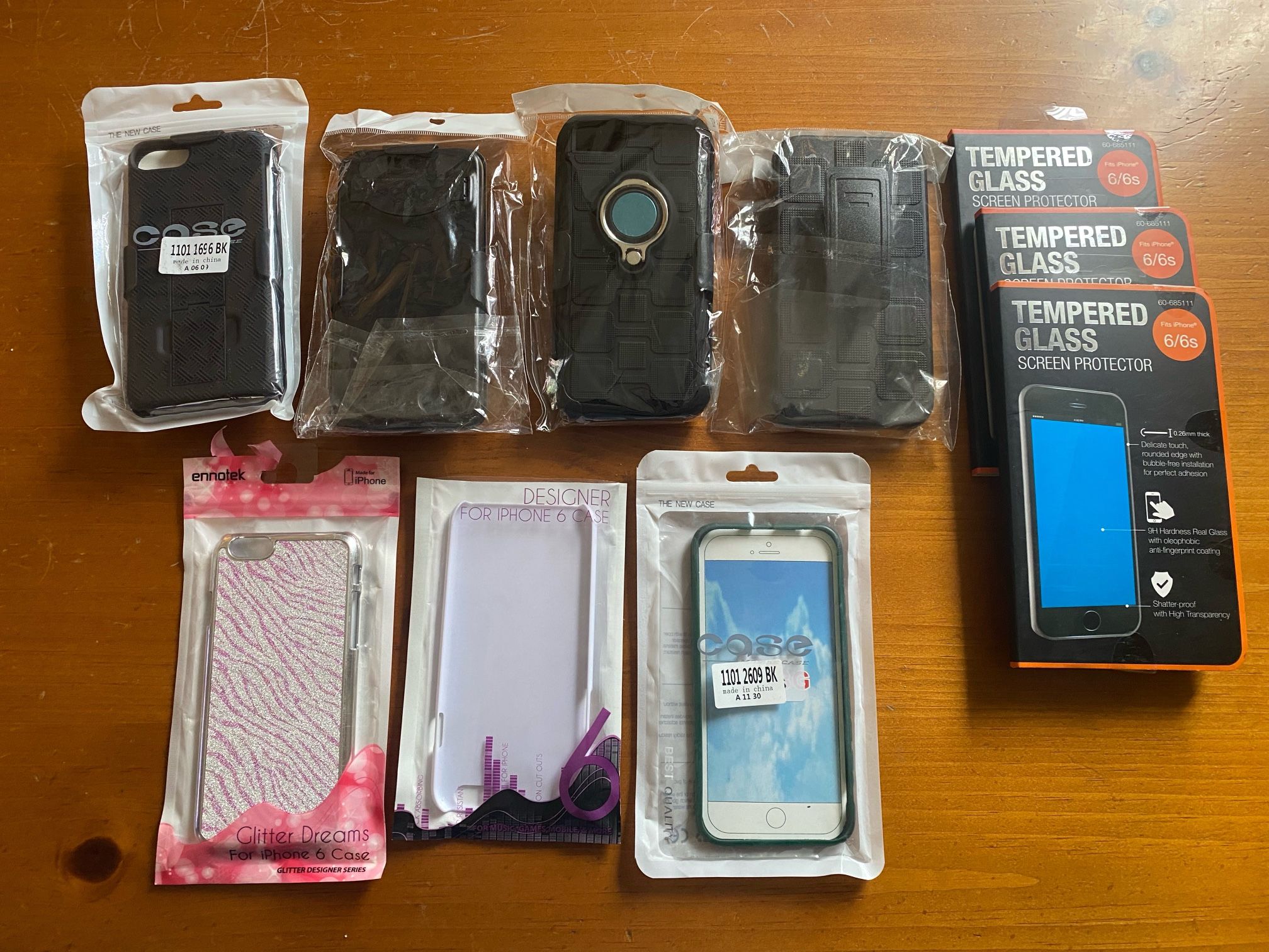 4 new complete holster belt clip cases. 3 new tempered screen protectors. 3 new snap on cases. Bought for iPhone 6 but according to Google will fit iPhones 6,7,and 8 Selling all together. Won’t split up! 5 dollars total for everything!!!