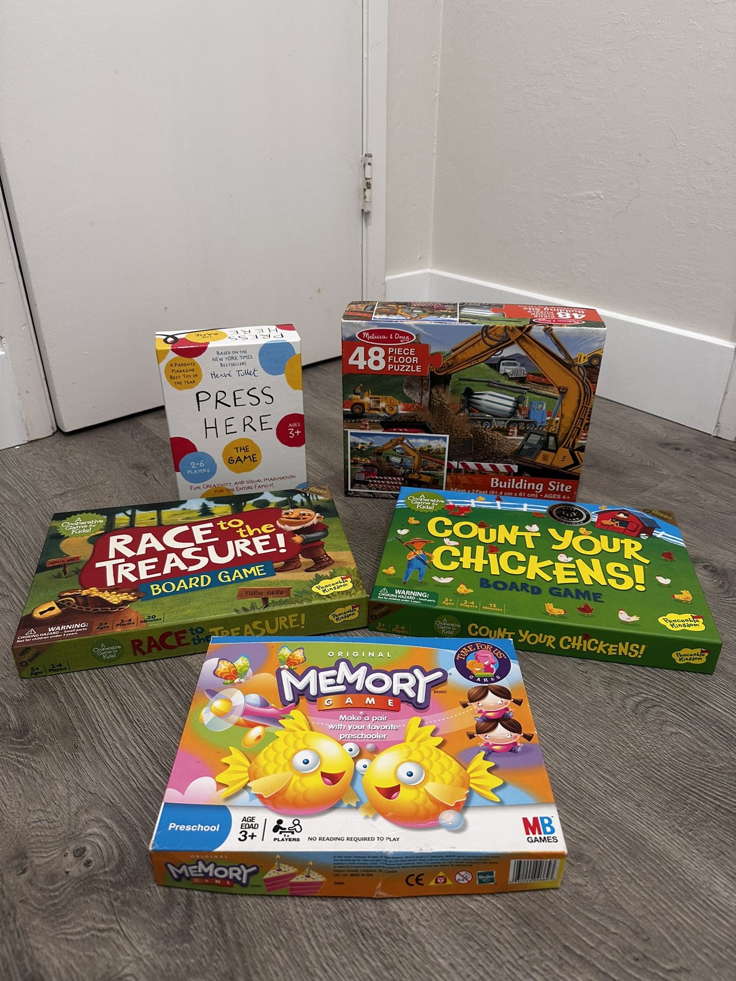 Melissa and Doug giant truck puzzle: $5 Race to the Treasure board game:$5 Press Here board game: $5 Count your Chickens board game: $5 Memory Game$3