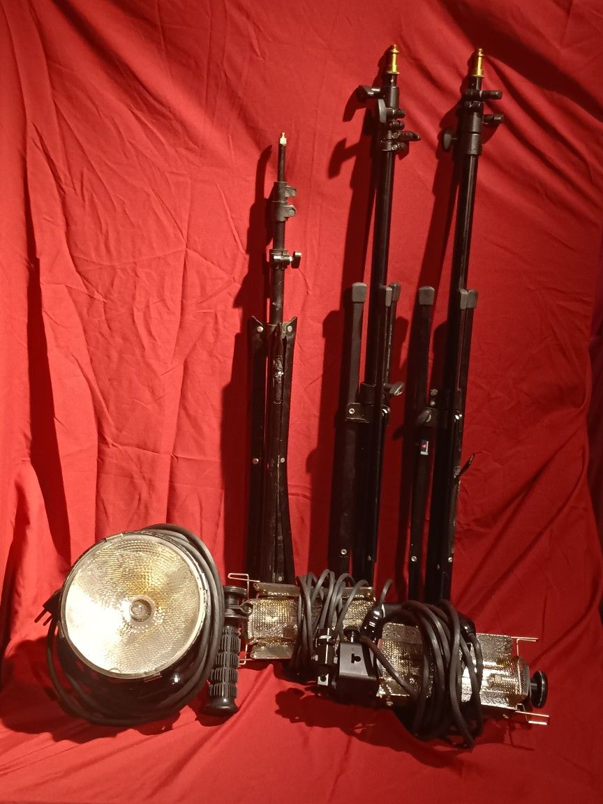 1 Lowel DP Light 1000w Focus Flood 2 Lowel Tota-Lights Tungsten Flood Lights (750W/120V) With Bulb Cord three stands