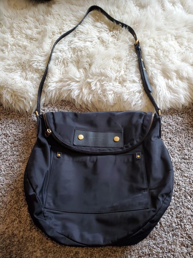 Crossbody messenger by Marc Jacobs the Natasha. Adjustable crossbody strap with *huge* zippered closure. Black nylon exterior. This will fit everything and is great for travel, or busy parent. A second enclosure- is sewn into material magnetic (see photos). Features also include has zippered extra pockets with 2 open pockets. Have a lot of other great items, feel free to check them out. 13in L x 4in D x 11in H I have 3 other handbags listed, a Kate spade, Coach & Marc Jacobs. I would bundle all 4 for $250