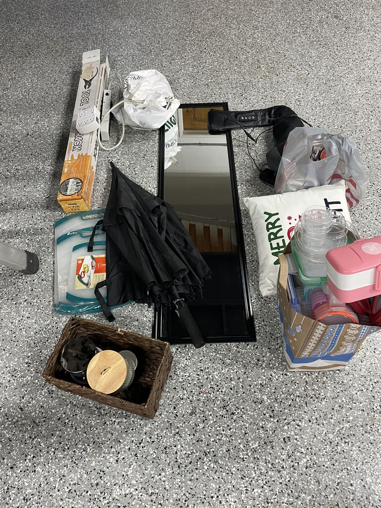 Some items not pictured!! $20 for all just take it, lots of Tupperware, new cutting boards, unused bench tool rack, mirror, new umbrella, neck massager (used once), etc etc. Everything washed and sanitized.