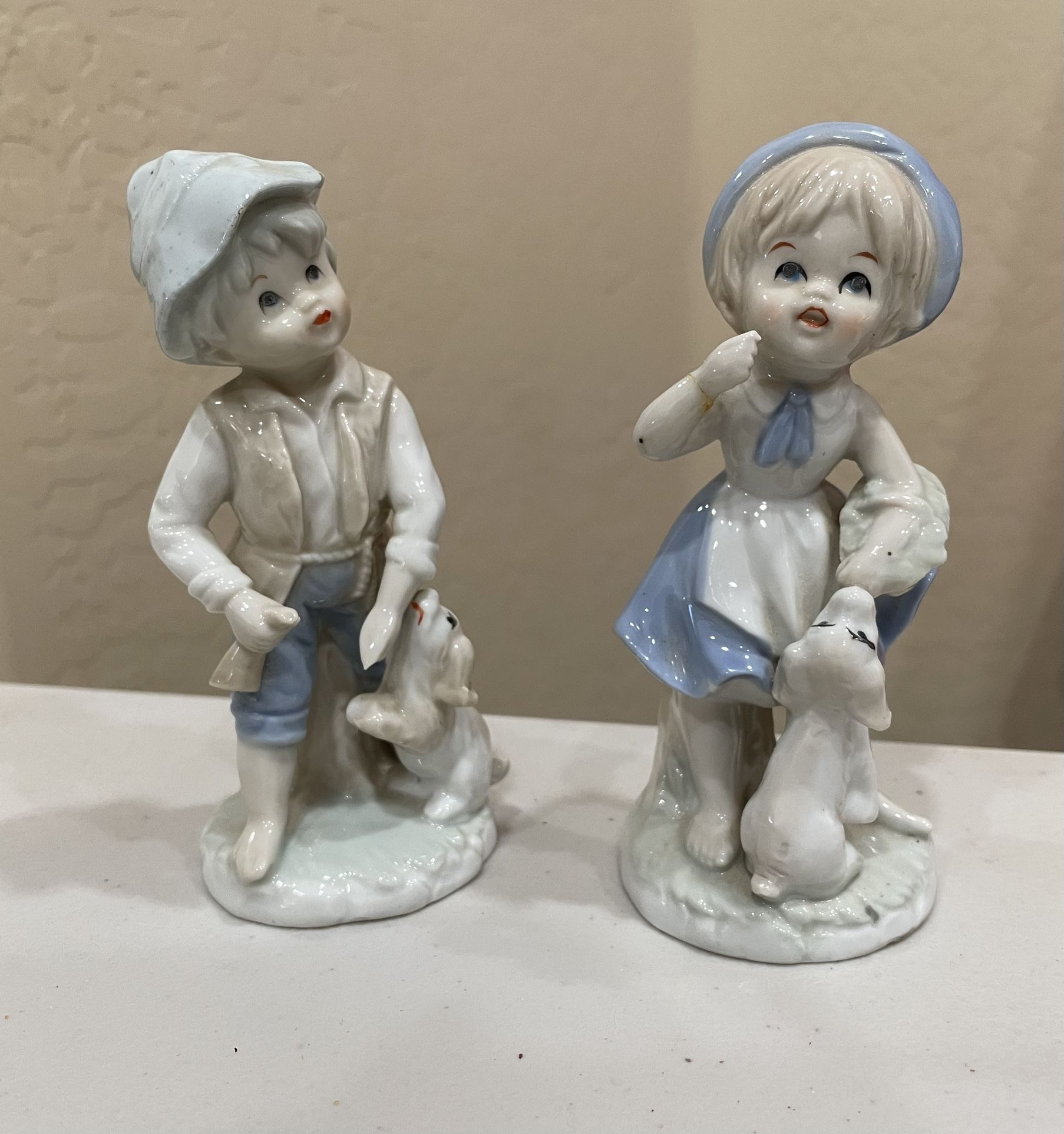 2 Cute boy and girl figurines with puppies. Approximately 4” tall. Boy has small chip on hat. $25 for both
