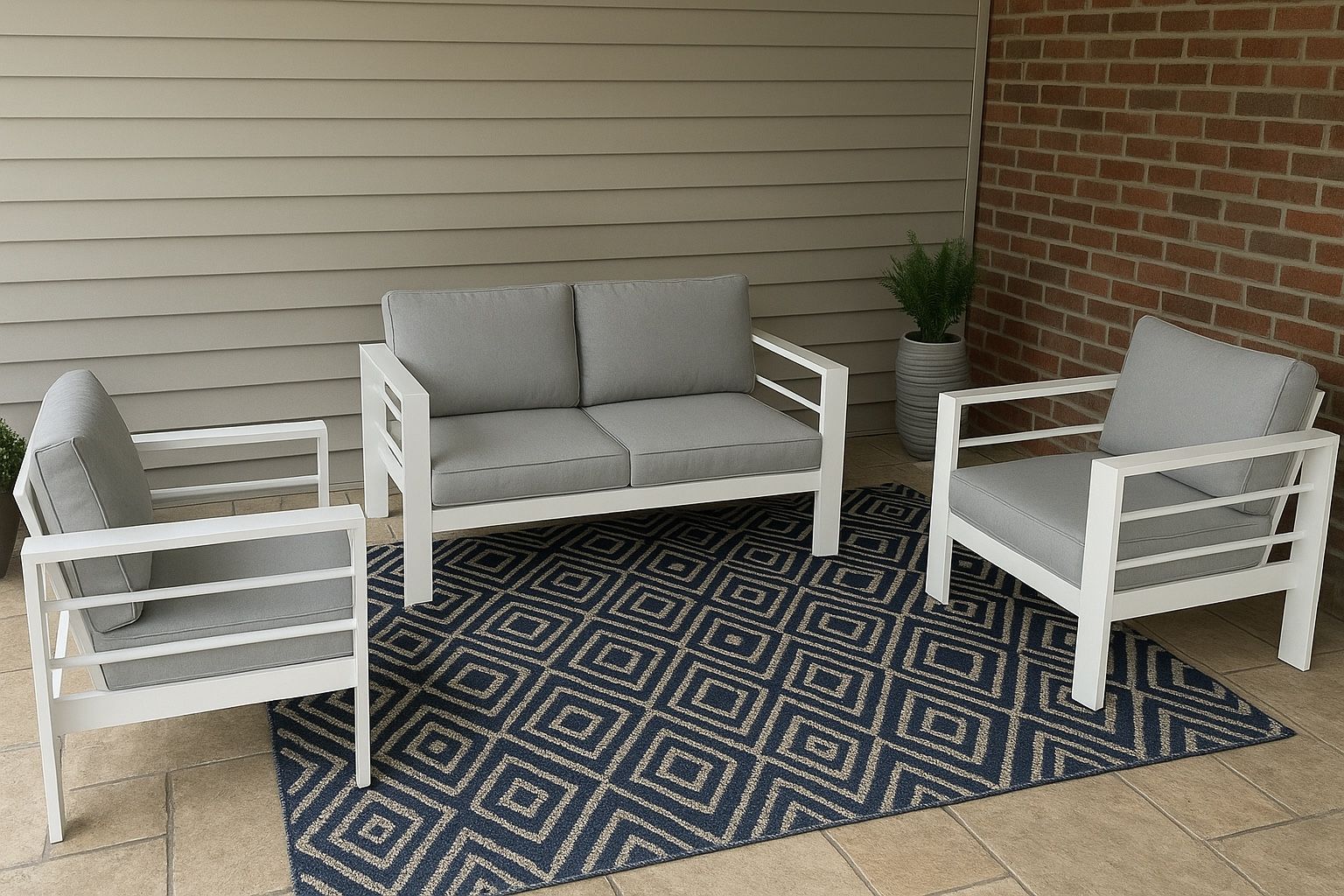 some serious cash saving by getting the set here. Not All patio furniture created equal — Aluminum Outdoor Patio set, All-Weather Outdoor Couch With Thick And Soft Cushion Just out of the box and assembled = ready for someone backyard for Christmas. Beautiful Designer 3 piece. White frame and gray cushions All the chairs come with covers $$$ Selling it as you see the picture- not separate it. Local Free Delivery *** Location: Military & Hypoluxo. **** First come, first served. No hold on merchandise. See all of my listings. Thank you for looking. NO REFUNDS OR EXCHANGES ALL SALES ARE FINAL