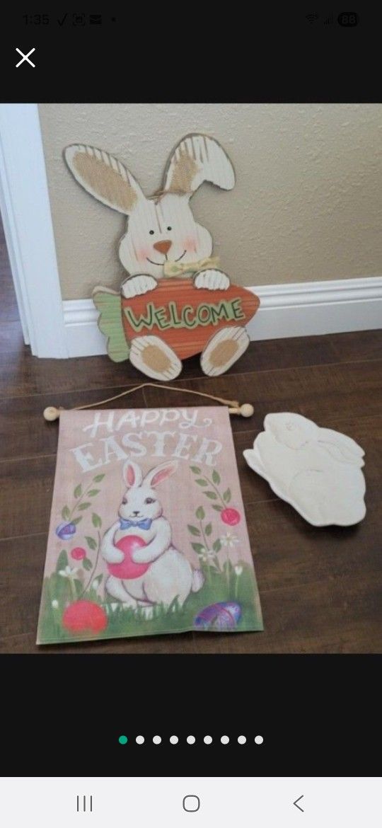 All new. ***SEE INDIVIDUAL PRICES *** - Earthenware bunny small dish is microwave and dishwasher safe. From Pier1. 9 3/4" x 7 1/4", $7.00. - Wood wall hanging bunny, 17.5" tall by 11.5" wide. $12.00 - Wall flag 16" tall by 11 3/4" wide. $4.00 Cash only