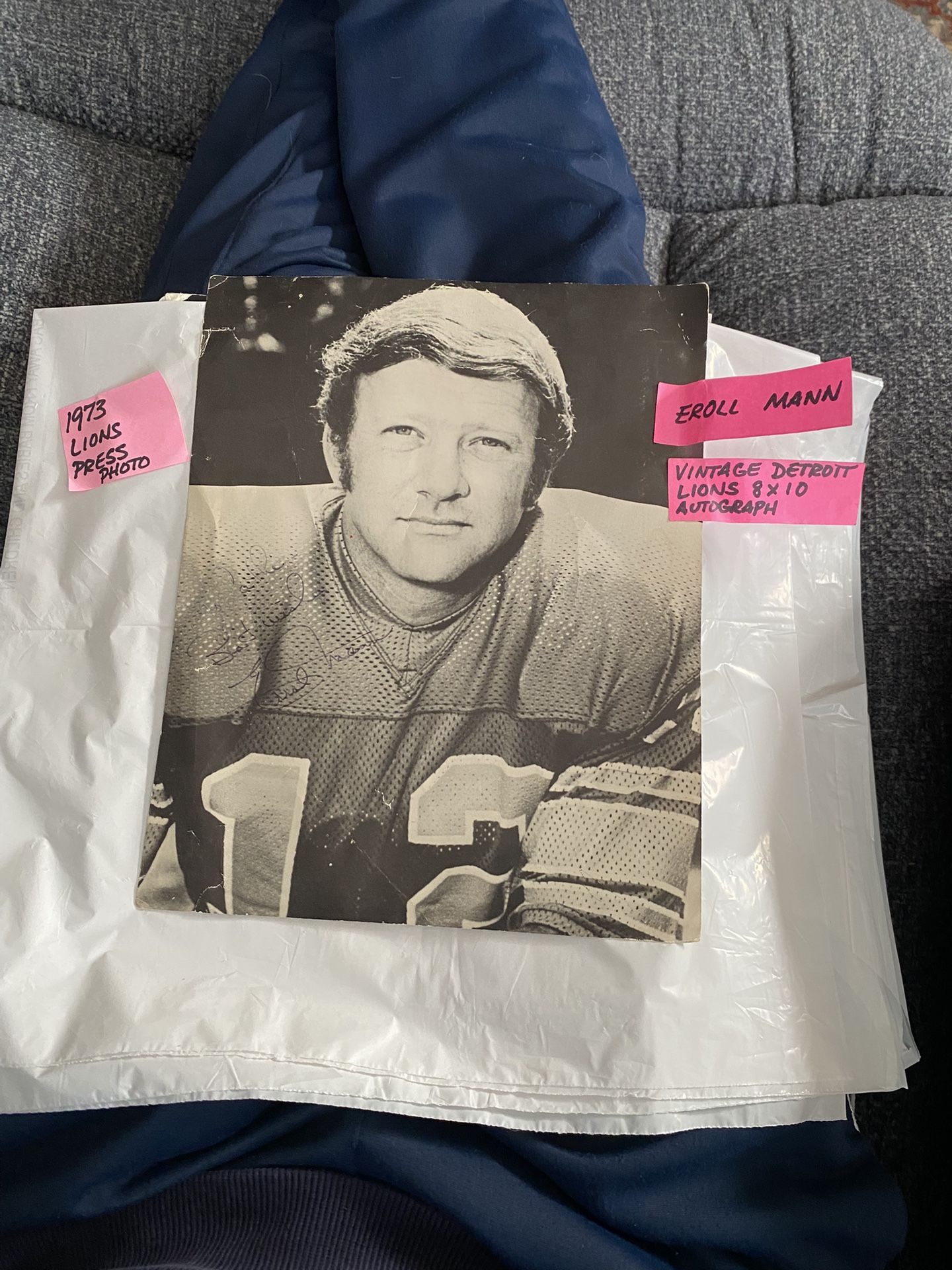 Detroit Lions signed Eroll Mann Photo $18.00 I’m selling a signed Detroit Lions black and white 8”x10” photo of Eroll Mann for $18.00 plus shipping cost from Canton, Michigan. This was taken in 1973 and is in good condition. I accept Venmo or PayPal for payment.