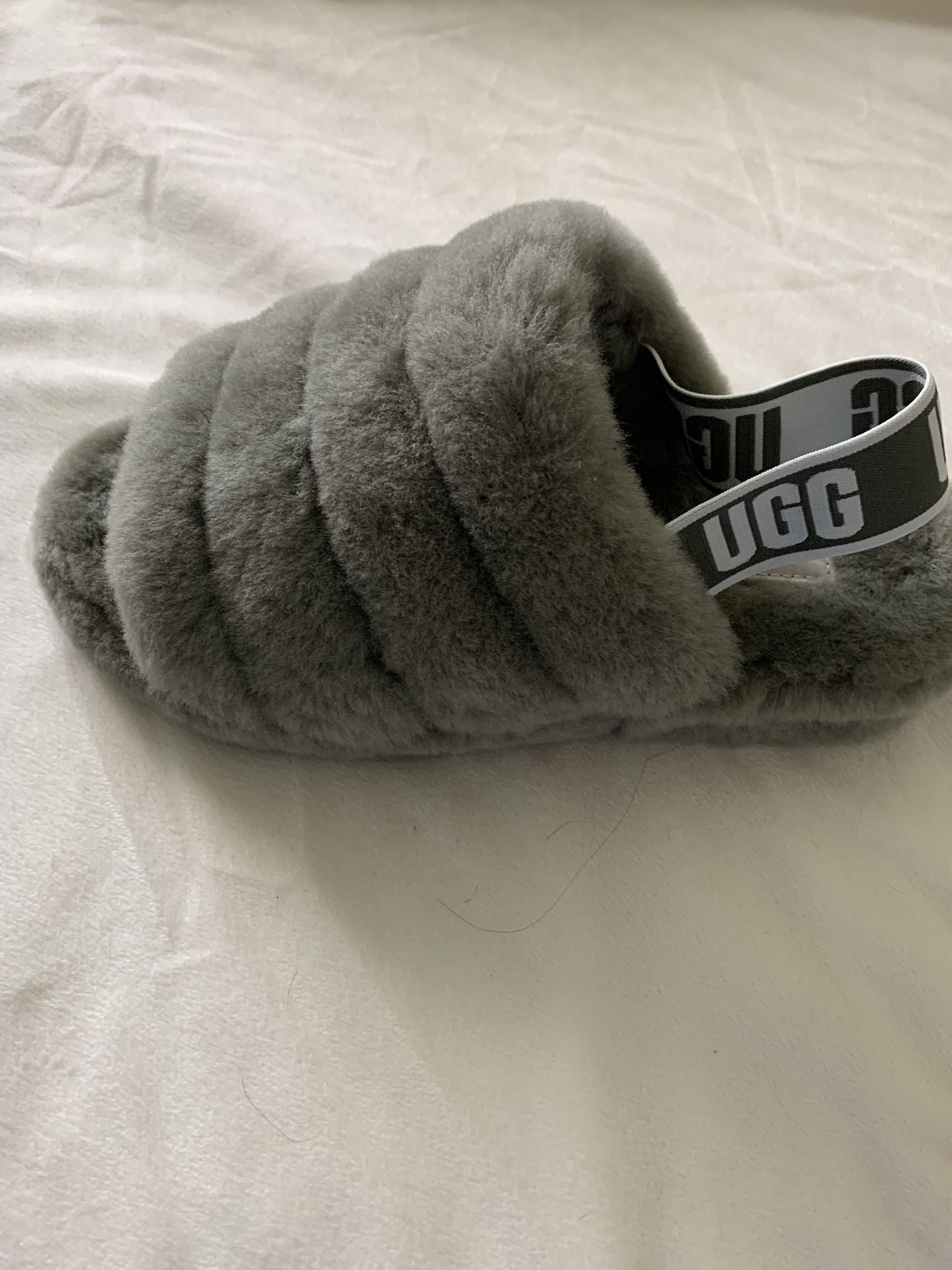 NEVER WORN size 7 Combining slipper and sandal into a cozy statement shoe, the Fluff Yeah is as good as it sounds and as soft as it looks. Featuring plush sheepskin with a lightweight platform to keep things airy, this standout slide pairs perfectly with midi dresses or your favorite jeans. Details 10mm sheepskin upper Elastic strap with UGG® graphic 10mm UGGplush™ 80% upcycled wool, 20% lyocell lining 10mm sheepskin insole Sheepskin-wrapped midsole Molded rubber outsole 1.5" heel height Woven label with UGG® logo on insole RN 88276 This product contains real fur from sheep or lamb. Fur may be sourced from Australia, Ireland, the United Kingdom, or the United States. It has been artificially dyed and treated.